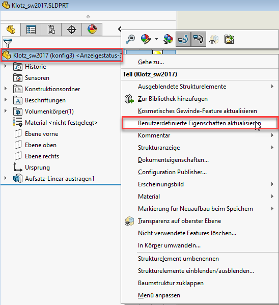 Mit rechter Maustaste im Featurebaum das aktuelle Part anwählen und im Kontextmenu "Benutzwerdefinierte Eigenschaft aktualisieren anwählen.