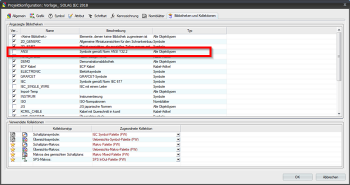 Diese Anleitung zeigt auf, wie Sie die IEC-Vorlage entsprechend ändern müssen, damit die ANSI-Symbole nicht mehr in der Standardauswahl aufgelistet werden. Dieselbe Überlegung gilt für alle anderen Vorlagen wie auch alle anderen Normen.