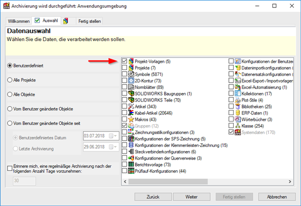 Wenn nur die Vorlagen gesichert werden sollen, reicht es in der Maske Auswahl lediglich die Projekt-Vorlagen zu aktivieren.
