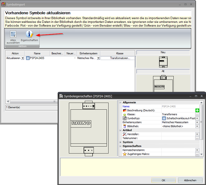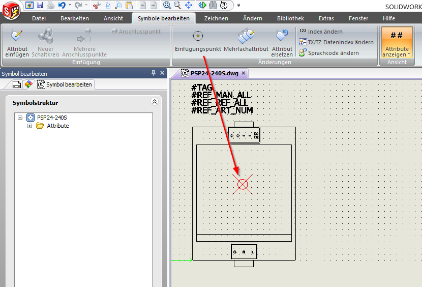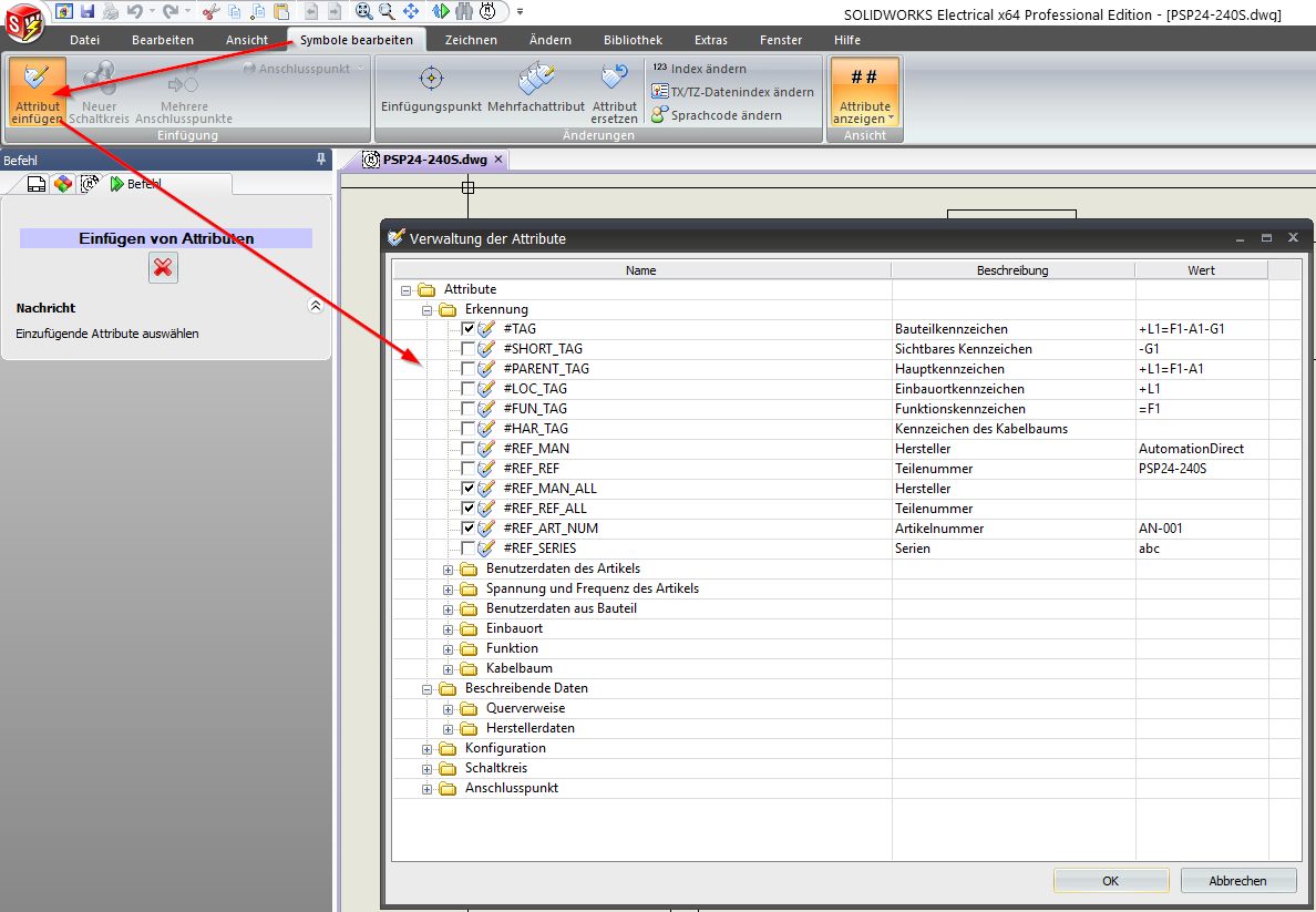 Öffnen Sie das importierte Symbol. Falls durch den Import die Attribute nicht vollständig und korrekt vorhanden sind, müssen die gewünschten Informationen noch hinzugefügt werden. Dies erfolgt mit dem Befehl Attribute einfügen im Register Symbole bearbeiten. Wählen Sie die hinzuzufügenden Attribute aus.