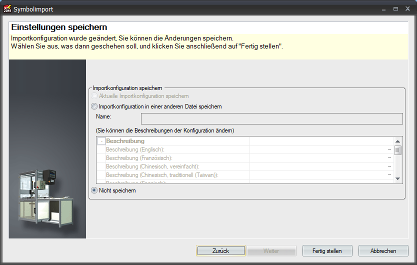 Wurden Attributzuweisungen vorgenommen, kann diese Zuweisung in einer Konfigurationsdatei gespeichert werden. Diese gespeicherte Konfiguration ist dann extrem zeitsparend, wenn öfters Symbole mit denselben Eigenschaften importiert werden müssen. Ist diese Importaktion einmalig oder es wurden keine Attribute zugewiesen, kann in folgenden Schritt Nicht speichern gewählt werden. Gespeicherte Konfigurationen können im zweiten Schritt des Importprozesses ausgewählt werden.