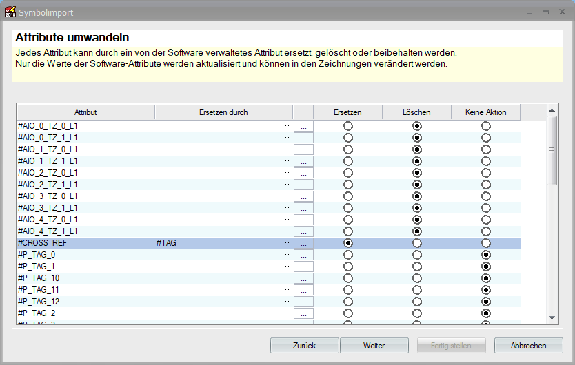 Falls die DWG-Datei Textattribute enthält, könnten diese durch SOLIDWORKS Electrical Attribute ersetzt werden. Dieser Schritt ist meistens nur möglich und sinnvoll, wenn von einem anderen ECAD Symbole importiert werden.