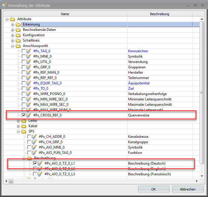 Besteht das Symbol und sind benötigte Stromkreise (wie hier für die Speichsung) ergänzt worden, müssen die Attribute des Querverweises wie auch jene für die Beschreibung hinzugefügt werden.