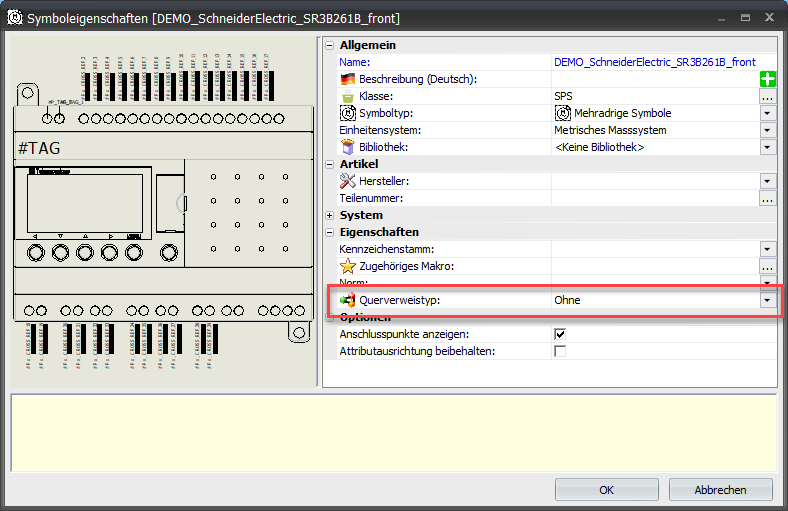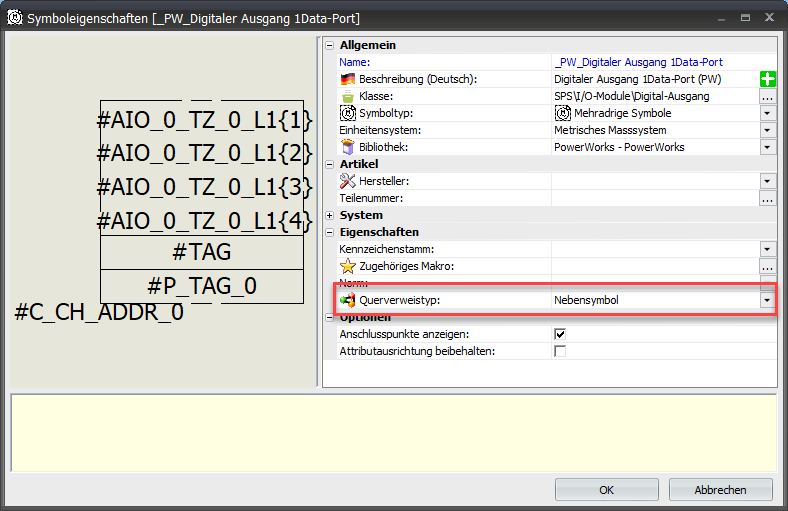 Hinsichtlich der Querverweisangaben muss eine zusätzliche Einstellung vorgenommen werden. Das SPS-Karten- wie auch die Kanalsymbole müssen eines speziell definierten Typs sein. Sehen Sie dazu auch den Beitrag Querbezüge in SOLIDWORKS Electrical verwalten.