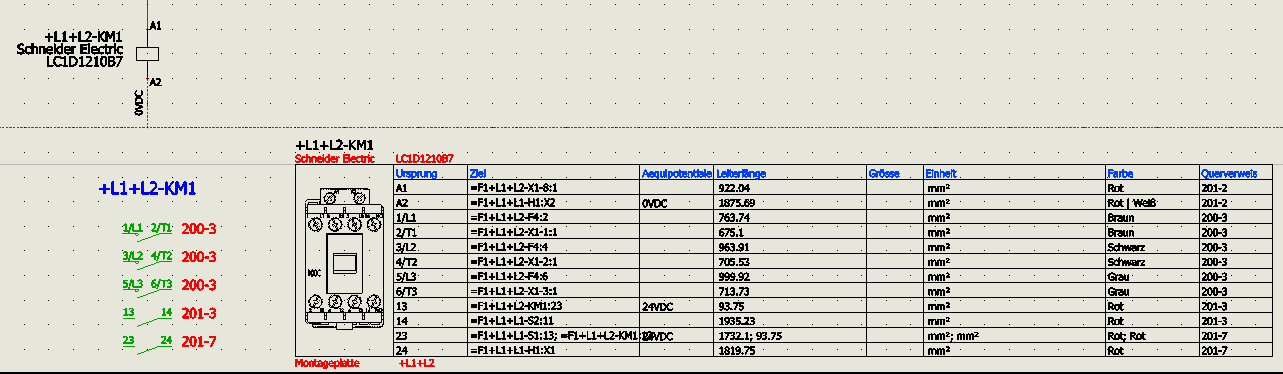 Dieses Beschriftungssymbol kann prinzipiell jedem Element angehängt und dessen Informationen wiedergeben. Sei dies in tabellarischer oder in graphischer Form. Das folgende Beispiel zeigt die Berbindungsansicht eines Leistungsschützes.