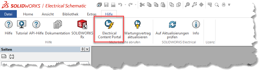 Sie greifen auf das ECP via Webseite zu, indem Sie in SOLIDWORKS Electrical Schematic, im Menü Hilfe, die Schaltfläche Electrical Content Portal drücken.