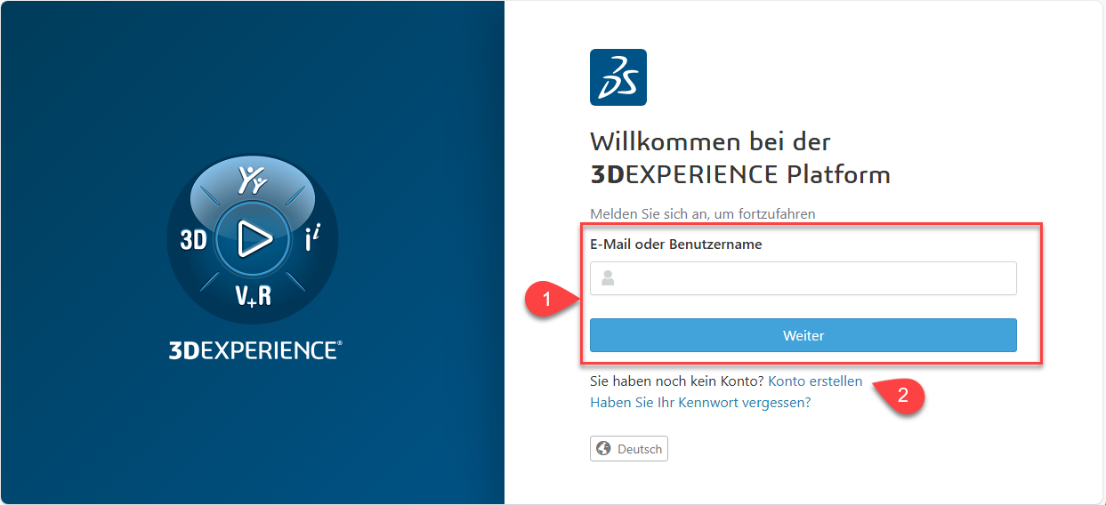Loggen Sie sich mit Ihrer 3DEXPERIENCE-ID (1) ein oder erstellen Sie sich spätestens jetzt Ihren Zugang (2).