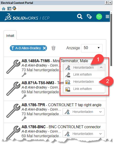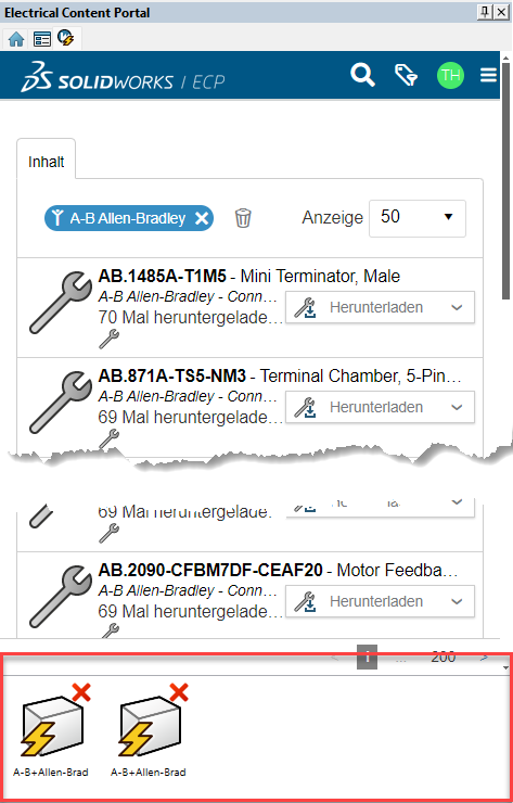 Die benötigten Bibliotheken können nun aus der Browsersicht des ECP heruntergeladen und mittels Befehl Anwendungsumgebung entachivieren eingelesen werden. Wie dies gehandhabt werden muss, zeigt Ihnen das Schulungshandbuch und die Übung 1 in den Online-Tutorials von SOLIDWORKS Electrical Schematic (Menü Hilfe > Tutorial).