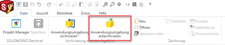 Wurden die benötgiten Pakete heruntergeladen, können diese am unteren Rand der Seitenpanele mittels Klick importiert werden. Dies startet wiederum den Befehl Anwendungsumgebung entachivieren. Dessen Handhabung finden Sie im Schulungshandbuch und in der Übung 1 in den Online-Tutorials von SOLIDWORKS Electrical Schematic (Menü Hilfe > Tutorial). Importierte oder nicht benötigte Pakete können in der Seitenpanele mittels rotem Kreuz gelöscht werden.