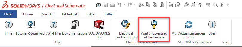 Nach erfolgreichem Login, oder spätestens nach einem Jahr, muss der Status Ihres Wartungsvertrags aktualisiert werden. Starten Sie dazu in SOLIDWORKS Electrical Schematic im Menü Hilfe den Befehl Wartungsvertrag aktualisieren. Dabei wird lediglich Ihre SOLIDWORKS Electrical Seriennummer resp. 3DX-Tenant-ID übertragen.