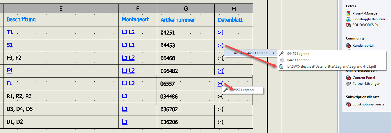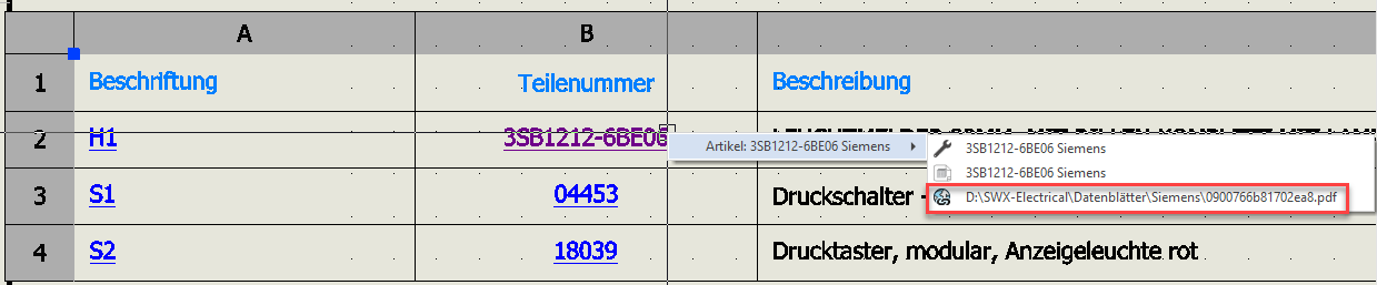 Wenn die Tabelle korrekt aufgebaut und in den Artikeleigenschaften ein Datenblatt verlinkt ist, kann dieses via rechter Maustaste in der Stückliste direkt aufgerufen werden. Sind pro Zeile zwar derselbe Artikel, dieser aber mehrfach gelistet, ist ein Aufrufen des Datenblattes erst ab SOLIDWORKS Electrical 2022 möglich.