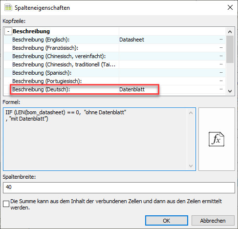 - Ergänzen Sie via fx-Icon folgenden Syntax und benennen Sie das Feld: IIF (LEN(bom_datasheet)==0, "ohne Datenblatt", "mit Datenblatt")
