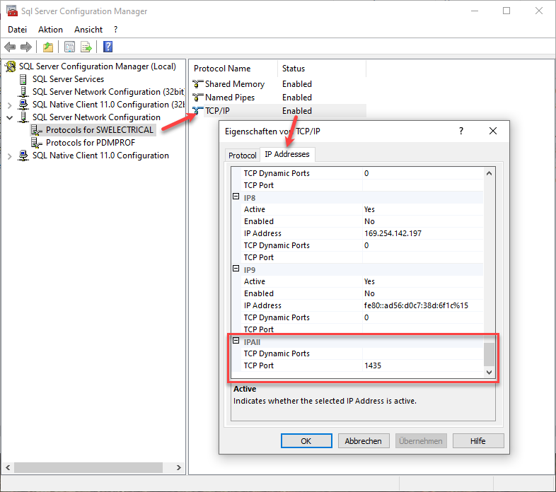 Vorgehen: Jede SQL-Instanz arbeitet standardmässig mit einem variablen Port, was die Kommunikation durch die Firewall verunmöglicht. Hier muss ein noch nicht genutzter Port definiert und in der Firewall geöffnet werden. Der Port der SQL-Instanz kann im SQL Server 20xy Configuration Manager, am Installationsort des SQL-Servers, geändert werden. Verwenden Sie nicht unbedingt den SQL-Standard-Port 1433.