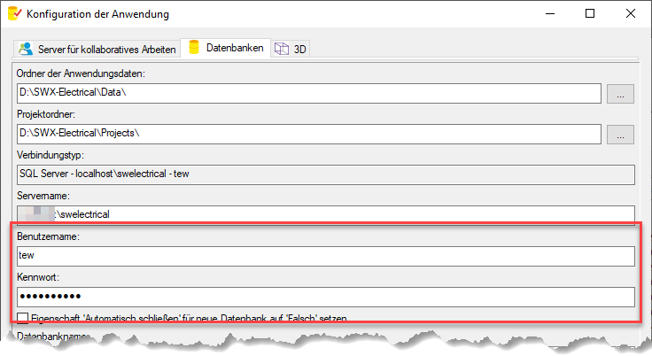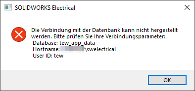 Passwortkonflikt. Wird SOLIDWORKS Electrical gestartet, verbindet sich das Programm über den SQL-Benutzer tew mit der SQL-Datenbank. Stimmt nun das in der Applikation definierte Passwort mit jenem der Datenbank nicht überein, schlägt die Verbindung fehl.