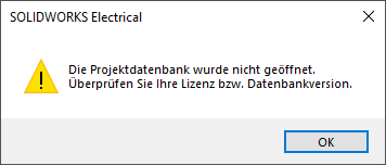 Gefolgt von der Meldung: Die Projektdatenbank wurde nicht geöffnet. Überprüfen Sie Ihre Lizenz bzw. Datenbankversion.