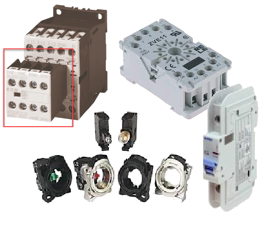 Beispiele: Hilfsschaltblock und anschraubbare Funkenlöschdiode zu Schütz, Hilfskontakt zu Sicherungsautomaten, Schaltkontakte, Leuchten & Gegenklemmelemente von Bedienelementen, wenn der farbige Taster als Basis-Artikel definiert ist, ein optionaler Resolver zu Motoren, etc.