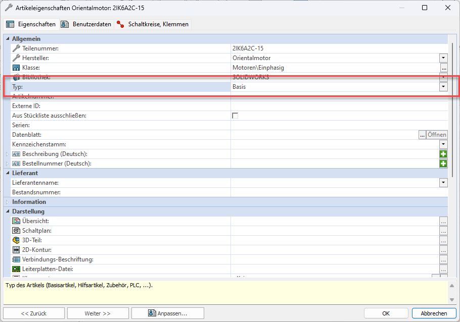 Dieser Typ wird für die allermeisten Artikel gewählt, die elektrische Schaltkreise aufweisen und keine SPS sind. Ausnahmen kann z.B. das Tastenelement einer Schalterbaugruppe darstellen.
