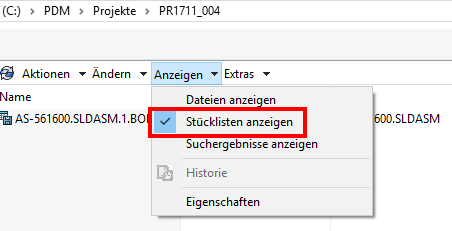 Um benannte Stücklisten in Windows-Explorer anzuzeigen, muss die Ansichtsoption auf "Stückliste " gesetzt werden.