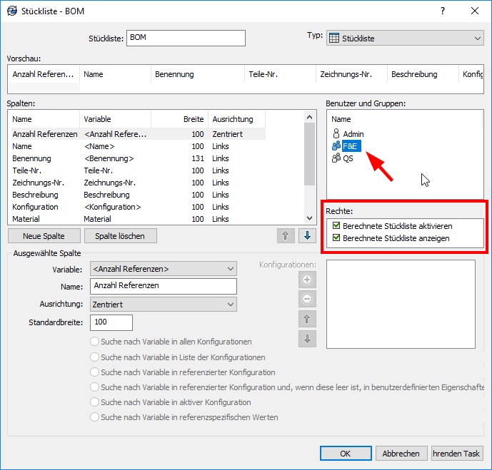 - Wählen Sie die Gruppen, denen Sie die Berechtigung zum Aktivieren bzw Anzeigen von Berechneten Stücklisten geben wollen