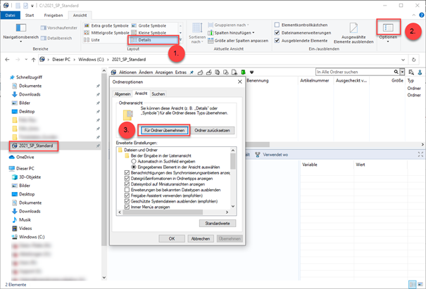 Rufen Sie ihr PDM-Stammverzeichnis (meist direkt unter C:\) im Windows-Explorer auf und folgen Sie den Schritten aus dem Screenshot. Wählen Sie die gewünschte Ansicht aus und bestätigen dies in den Ordneroptionen - Ansicht - Für Ordner übernehmen (Für alle Ordner dieses Typs) mit Übernehmen bzw. OK.