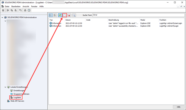 Unter dem Knoten „Lokale Einstellungen“ finden Sie den Punkt „Logdatei“. Mit einem Doppelklick lässt sich diese Logdatei öffnen. Über den im Screenshot markierten Button können Sie diese kopieren, die Datei befindet sich nun in der Zwischenablage und kann an gewünschtem Ort (mit Strg+V) abgelegt und anschließend an uns weitergeleitet werden.