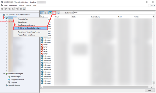 Ebenfalls über die PDM Administration erreichen Sie die Archivserver-Logdatei mit einem Rechtklick auf den Archivserver (rot markiert im Screenshot). Wählen Sie „Archivserver-Protokoll anzeigen“ und führen Sie – wie im vorherigen Punkt beschrieben – den Kopiervorgang durch.