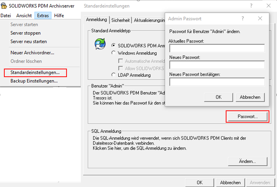 Dazu muss das aktuelle Passwort bekannt sein. Falls das aktuelle Passwort nicht mehr bekannt ist, kann das Passwort mithilfe der Solution S-065782 zurückgesetzt werden. Melden Sie sich dafür beim SOLIDWORKS PDM Support.