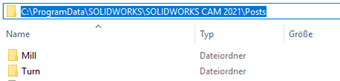 Die Standard-Postprozessoren werden bei der Installation in das folgende Verzeichnis abgelegt und zwischen Mill (Fräsen) und Turn (Drehen) unterschieden.