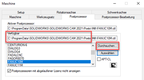 In SOLIDWORKS CAM werden gewünschte Postprozessoren entweder unter ‚Maschine definieren‘ angewählt: