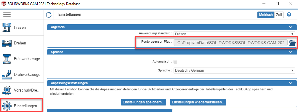 Oder der Verzeichnispfad wird ab SOLIDWORKS 2021 bereits in der Technologie-Datenbank, in den Einstellungen hinterlegt:
