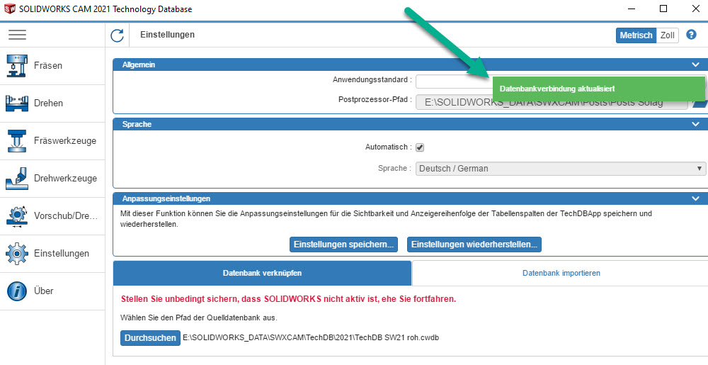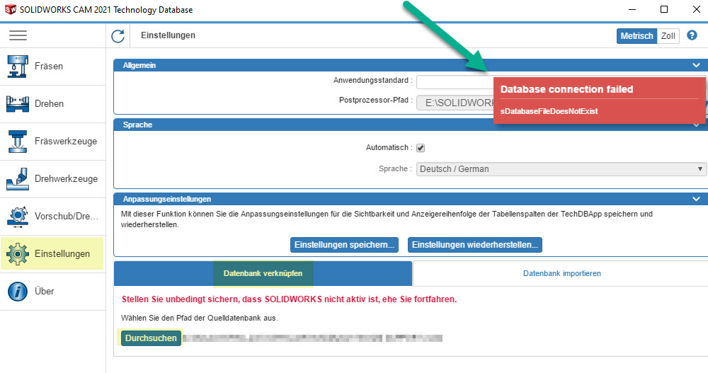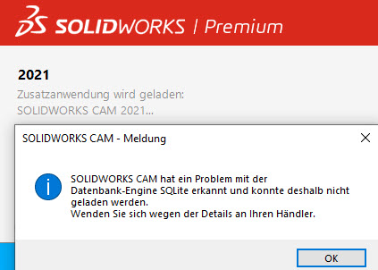 Wird die in der SOLIDWORKS CAM Technologie Datenbank verknüpfte Datenbank-Datei verschoben oder umbenennt, erscheint beim Start von SOLIDWORKS eine Fehlermeldung „Problem mit DB-Engine SQLite erkannt…“ und das CAM wird nicht geladen.