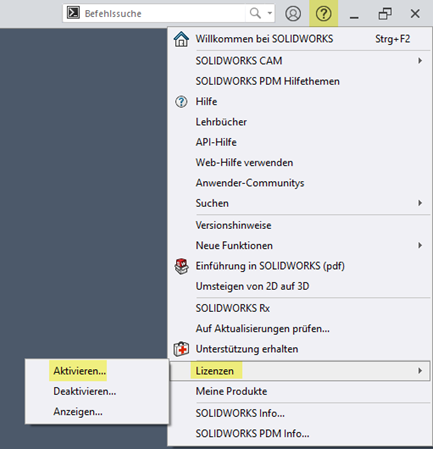 Einzelplatzlizenzen werden direkt in SOLIDWORKS unter Hilfe -> Lizenzen -> Aktivieren… und dem dann folgenden Dialog Reaktiviert.