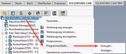 In der Operationsstruktur von SOLIDWORKS CAM über die rechte Maustaste auf den NC-Manager kann die Funktion Programmierblatt… -> Erzeugen… angewählt werden.