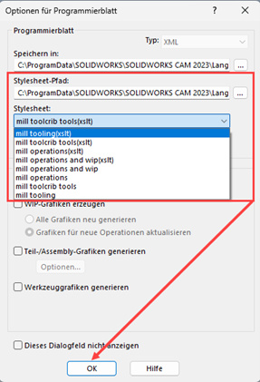 Standardpfad der Vorlagen: C:\ProgramData\SOLIDWORKS\SOLIDWORKS CAM 2023\Lang\English\setup_sheet_templates