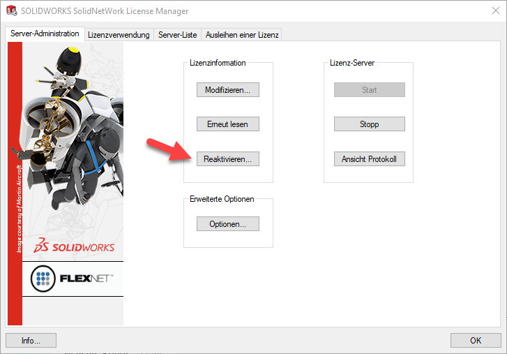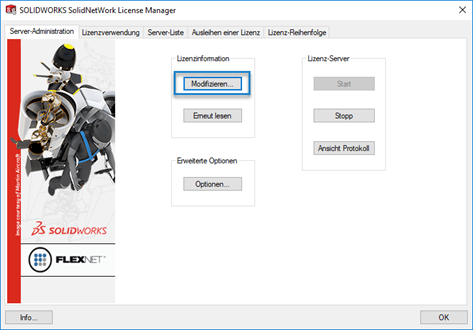 - Den SolidNetWork License Manager Server aufrufen (nicht den Client)