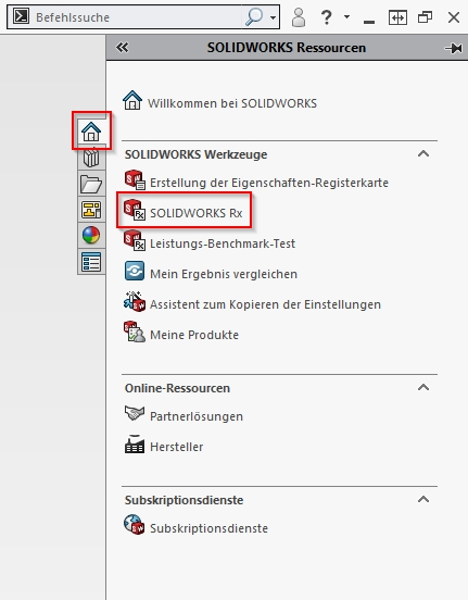 SOLIDWORKS > Task-Fensterbereich > SOLIDWORKS Ressource > SOLIDWORKS Rx