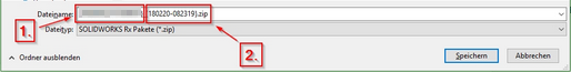 Der automatisch generierte Dateinamen besteht aus Ihrer SOLIDWORKS-Seriennummer (1.) sowie aus dem Datum und der Uhrzeit, wann die Rx-Aufnahme generiert wurde. Die Aufnahme kann nun abgespeichert werden.