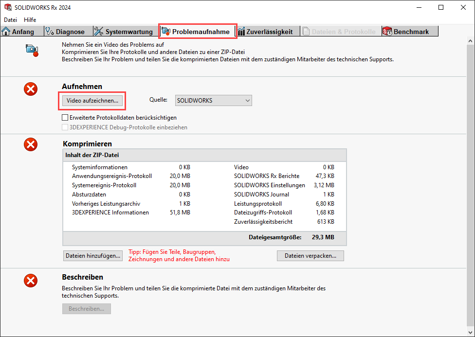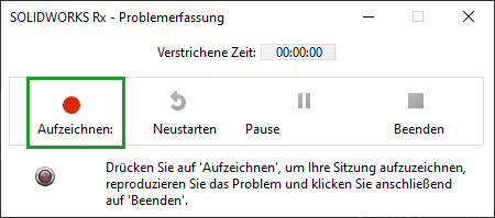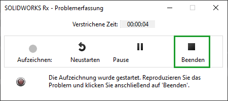 Nachdem die Aufzeichnung begonnen wurde, reproduzieren Sie in SOLIDWORKS Schritt für Schritt, wie es zu dem Verhalten des Programm, einem Absturz, oder Vergleichbarem kommt.
