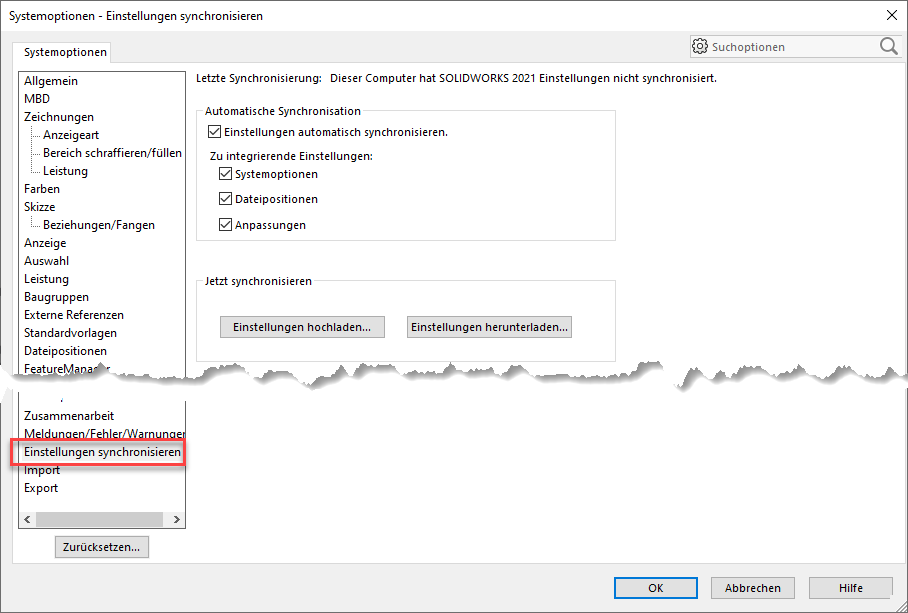 Nach erfolgreichem Login stehen Ihnen in den SOLIDWORKS Systemoptionen auch die Einstellungen zur Verfügung.