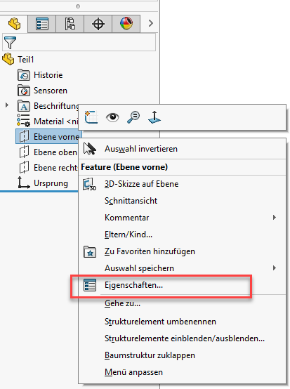 Starten Sie SOLIDWORKS. Wählen Sie Datei > Neu und Ihre erste Vorlage aus. Im Featurebaum wählen Sie nun auf einer der Grundebenen oder auf dem Teileursprung via rechter Maustaste > Eigenschaften.