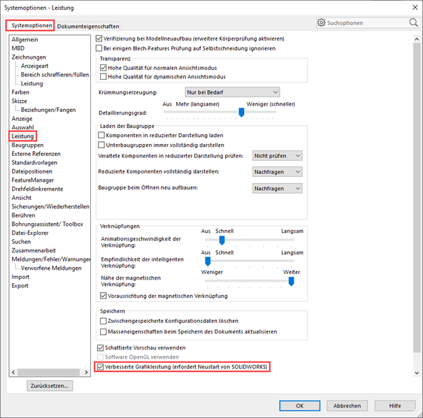 Die Option "Verbesserte Grafikleistung" (manchmal auch "Grafikpipeline" genannt) wurde mit der Veröffentlichung von SOLIDWORKS 2019 implementiert.