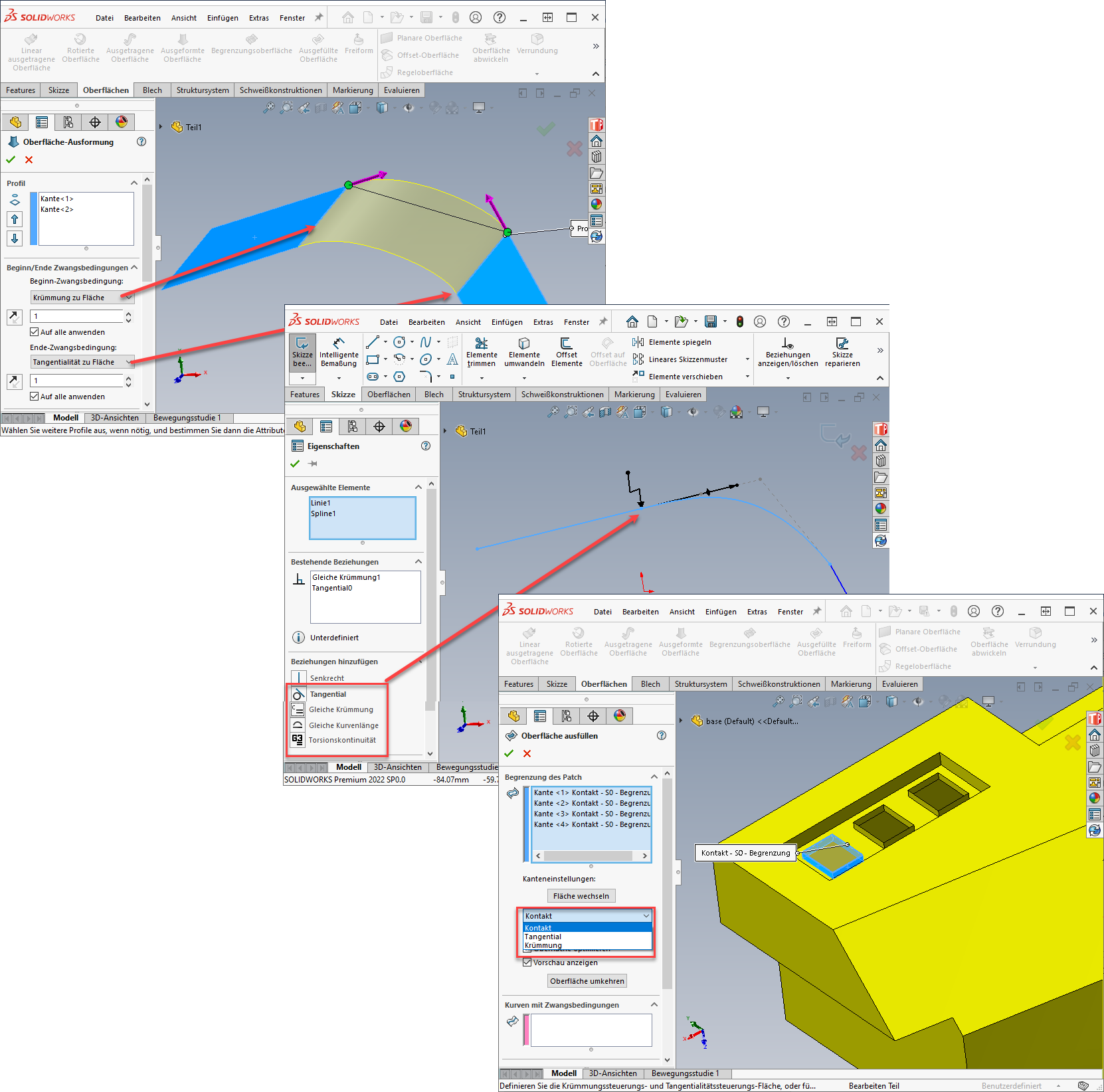 Die oben dargestellte SOLIDWORKS Meldung steht in direktem Zusammenhang mit kontinuierlichen Flächenübergängen, heutzutage erzeugt durch Splineübergänge, ausgeformte Körper und ähnliche Features.