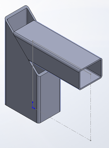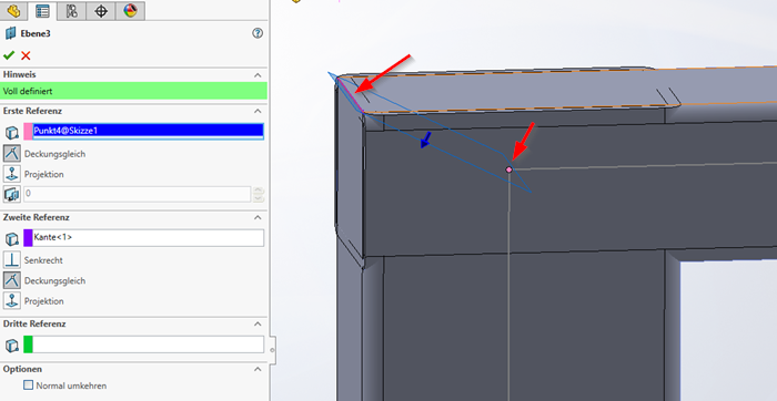 Hinzufügen einer Referenzebene, welche im nächsten Schritt als Trimmelement dient. Hier wird die rot markierte Körperkante sowie den Endpunkt der Skizzenlinie zur Erstellung der Ebene definiert. Alternativ kann auch eine Skizze als Stützelemente ergänzt werden.