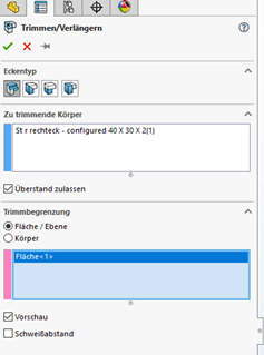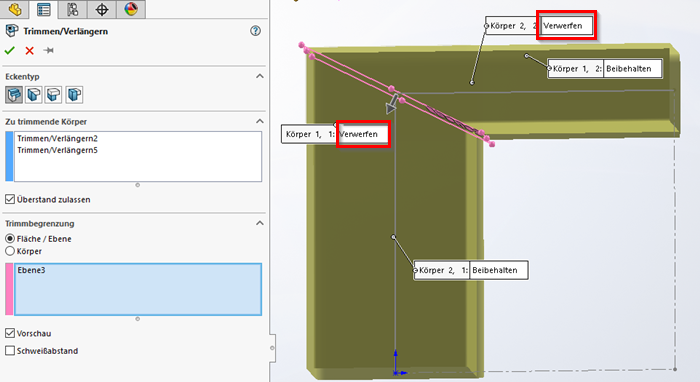 Nun kann mit dem Trimmen/Verlängern Feature die gewünschte Kontur erstellt werden. Dabei gilt es die Labels zu beachten, über welche durch ein simples Anklicken definiert werden kann, welche Volumen beigehalten resp. verworfen werden sollen.