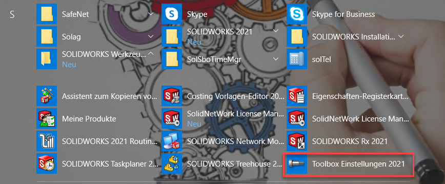 Alternativ kann der Toolbox/Bohrungskonfigurator auch direkt via Windows-Start-Menü aufgerufen werden: alle Apps, S wie SOLIDWORKS > SOLIDWORKS Werkzeuge > Toolbox Einstellungen 202x