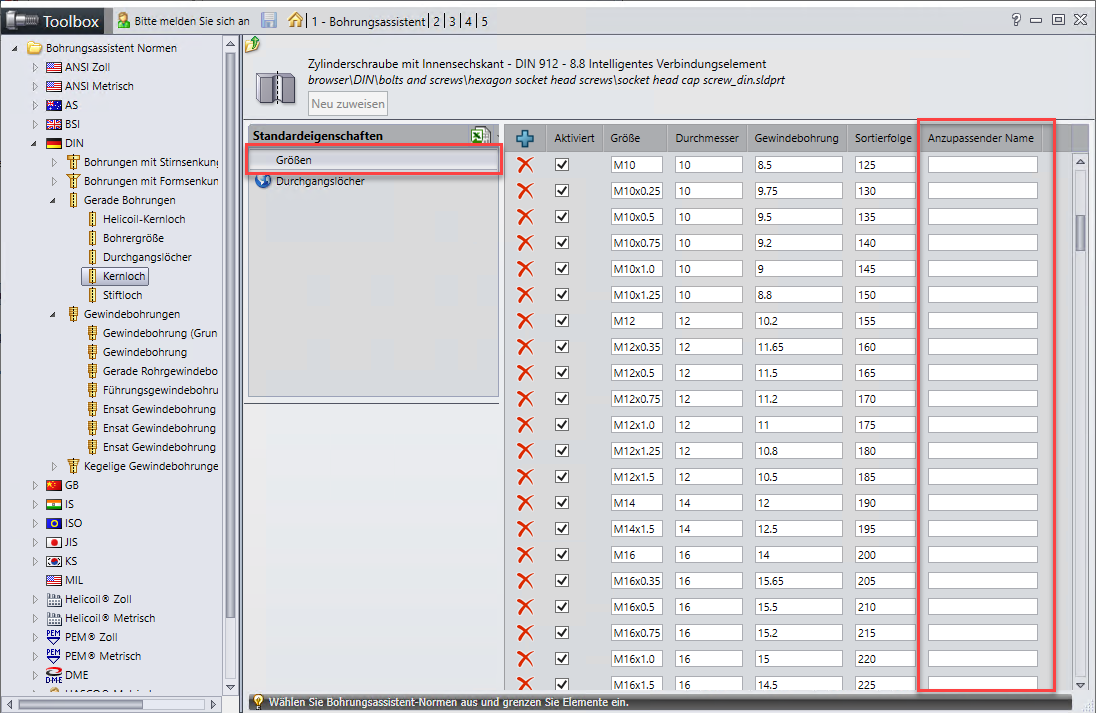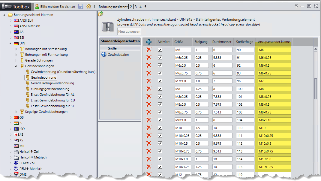 Diese Übergabe funktioniert aber leider nicht von sich aus. Es müssen dazu im SOLIDWORKS Toolbox-Konfigurator einige Ergänzungen vorgenommen werden.