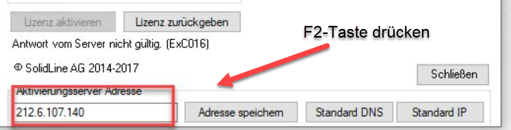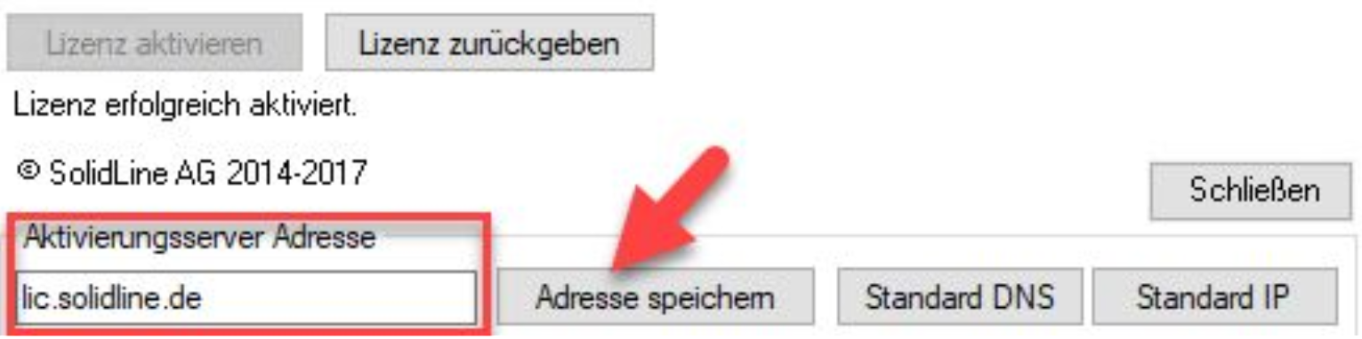 Die IP-Adresse sollte dann mit lic.solidline.de ausgetauscht werden. Die Adresse speichern und Lizenz aktivieren drücken.