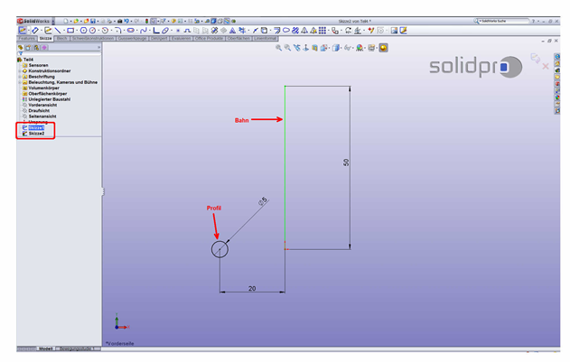 Erstellen Sie zwei Skizzen, wobei Sie in der einen eine Skizzenlinie definieren, die die Federhöhe bestimmt. In der zweiten Skizze definieren Sie den Federdurchmesser und die Federstärke.