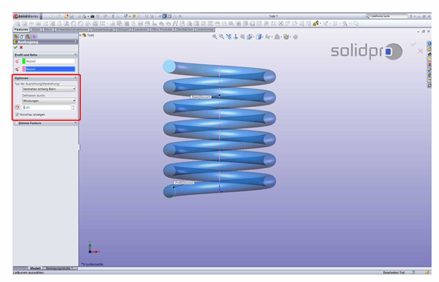 Selektieren Sie das entsprechende Skizzenelement für die Profil- und Bahndefinition. Wählen Sie unter Optionen bei "Typ der Ausrichtung/Verdrehung:" Verdrehen entlang der Bahn und bei "Definieren durch:" Windungen. Anschließend geben Sie noch die Anzahl der gewünschten Windungen ein.