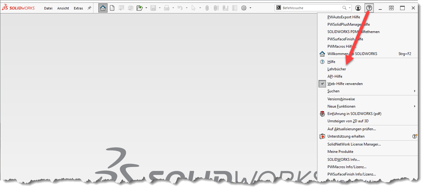 Ab SOLIDWORKS 2020 SP3 befindet sich das Hilfe-Menü auf der gegenüberligenden Seite hinter dem ?-Symbol.